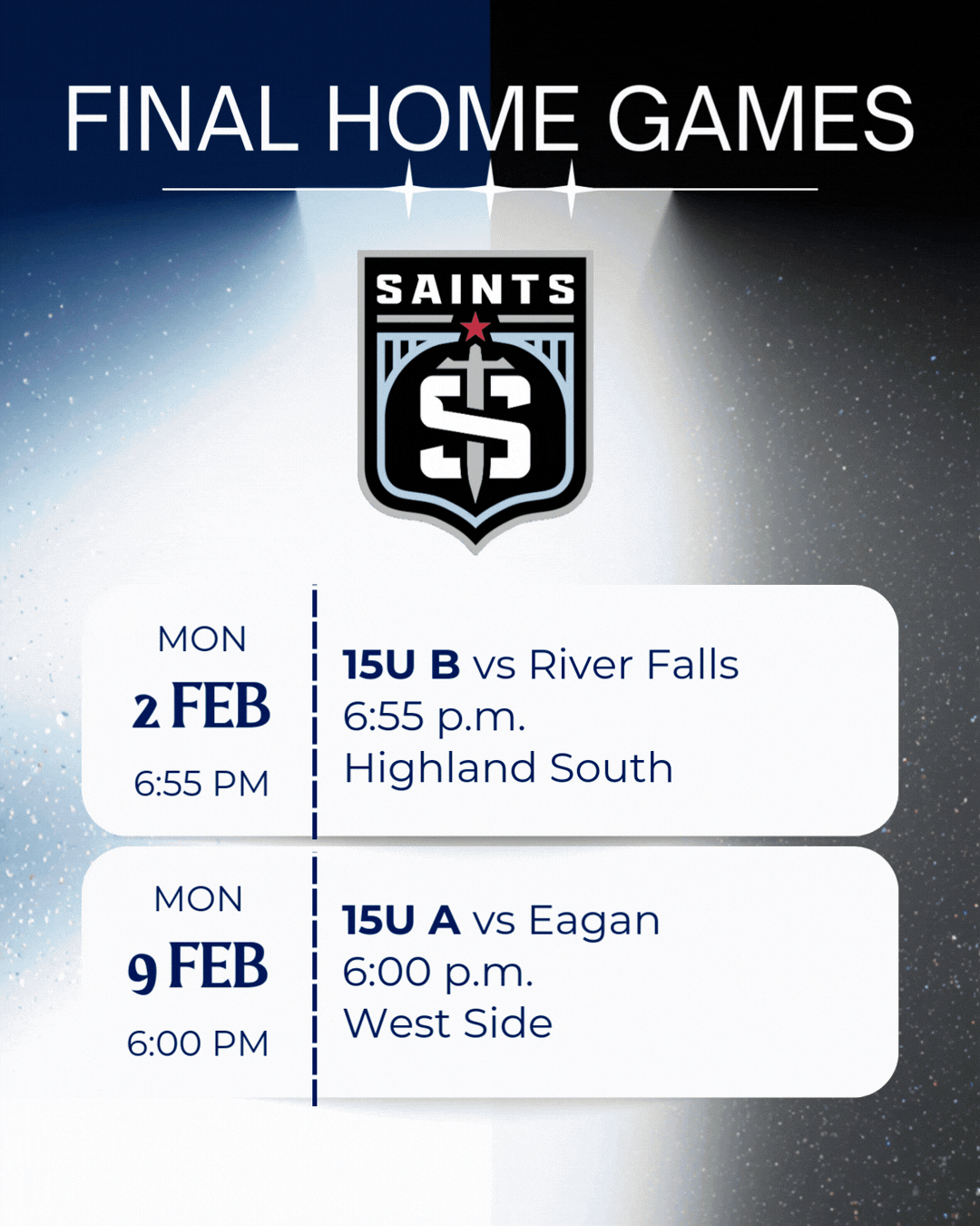 >> Monday, February 9th at 6:00 p.m. 15U A vs Eagan/Inver Grove Heights at West Side