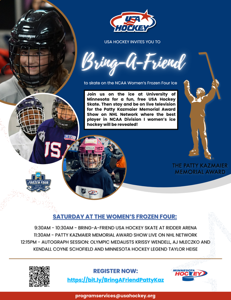 Saints players, bring a friend (even if they've never player hockey) to join this exclusive opportunity to skate this weekend on the NCAA Women's Frozen Four ice and attend the Patty Kazmaier Memorial Award Show live on NHL Network! The Patty Kazmaier Award is given annually to the top NCAA Division I women's hockey player. Then stick around for autographs from Olympic Medalists Krissy Wendell, AJ Mleczko, Kendall Coyne Schofield and Minnesota Hockey Legend Taylor Heise.