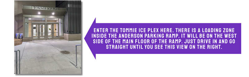 **NEW 10/27** If you continue just past the parking ramp upon entering the UST campus, the turnaround circle is now open for easy drop off. Your player will walk down the sidewalk between the parking ramp and the building to enter the rink through the same doors they use when being dropped off in the ramp loading zone.